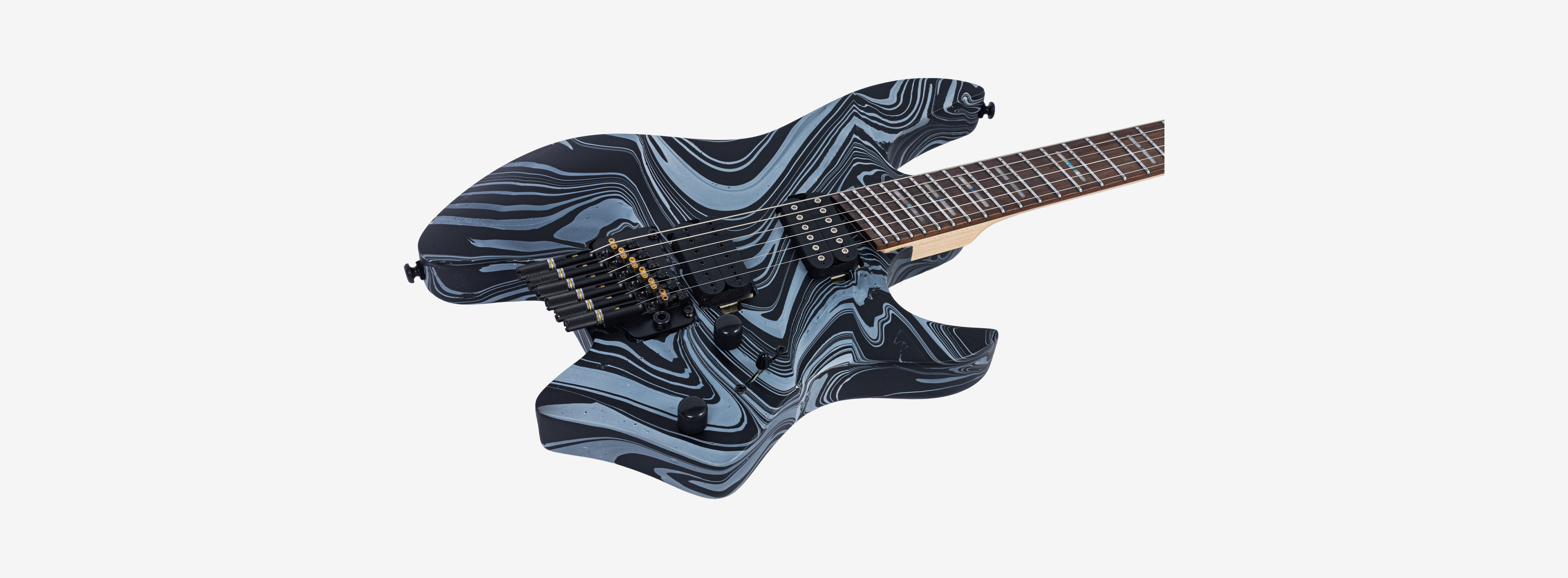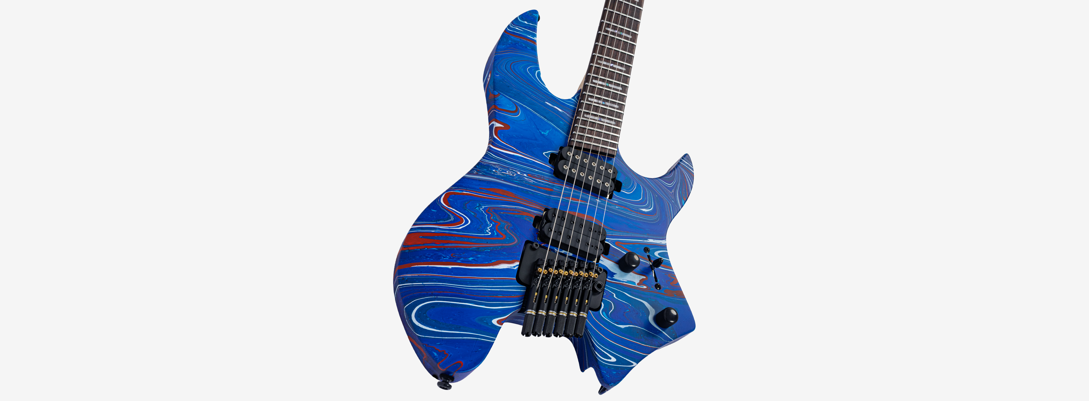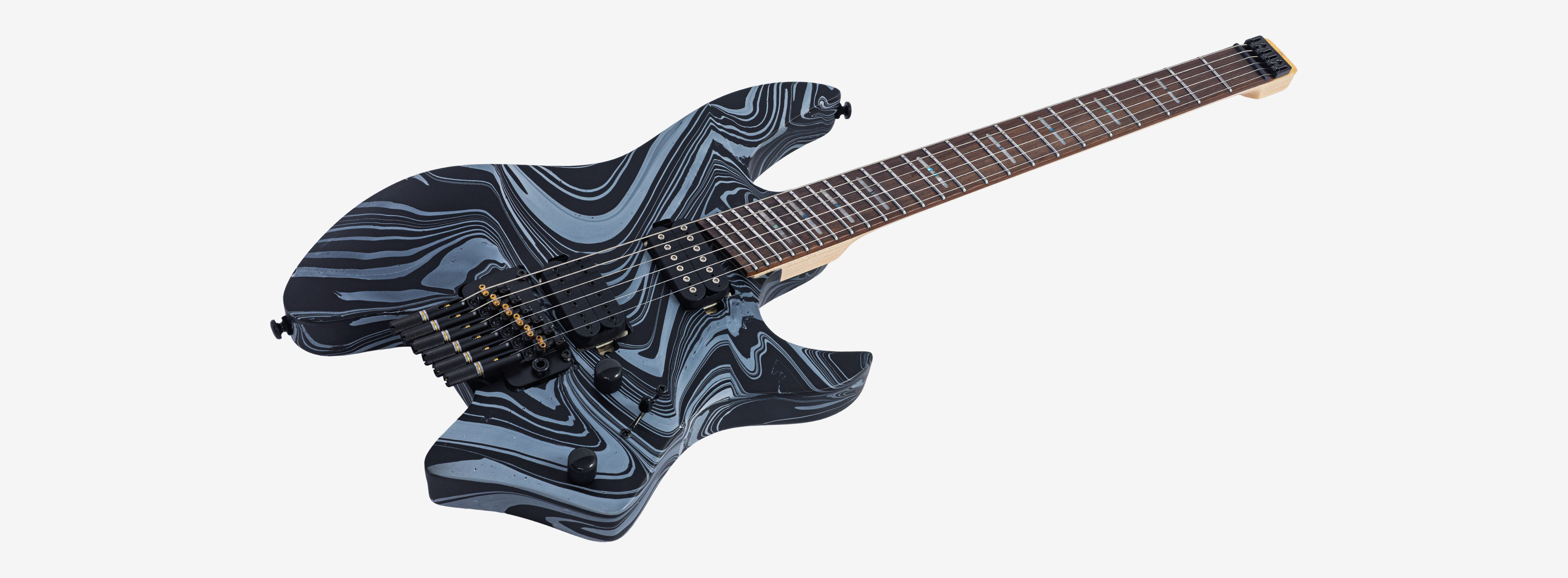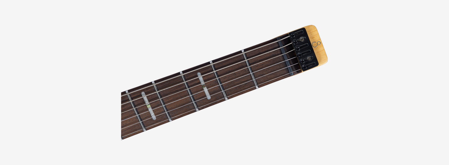 A bridge system designed for the headless style guitar featuring the tuners below the bridge plate promoting on point tuning action, and added stability for improved tone and sustain.