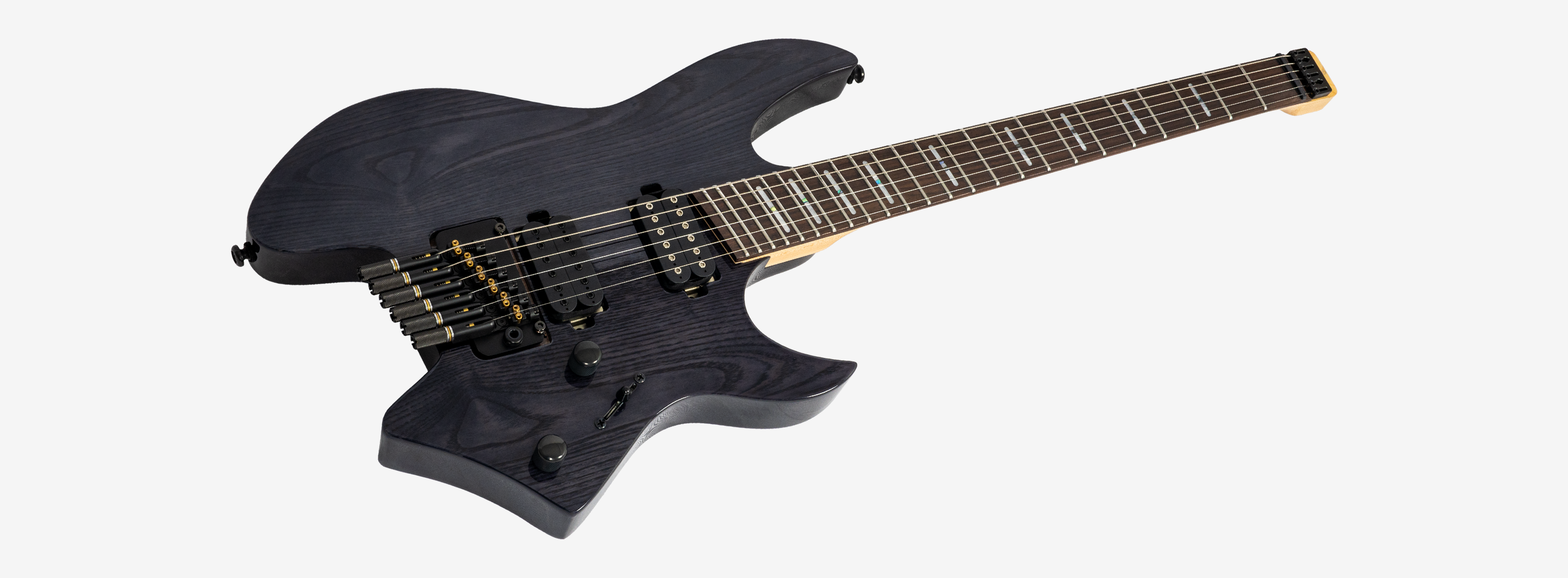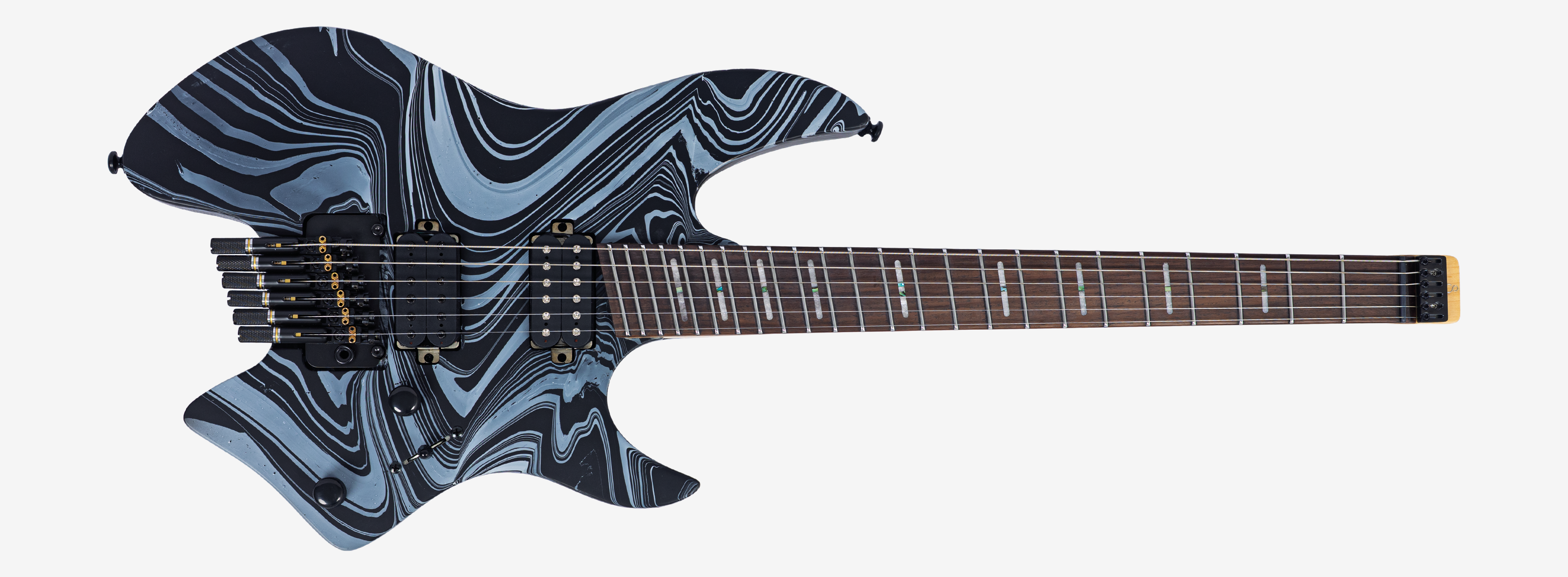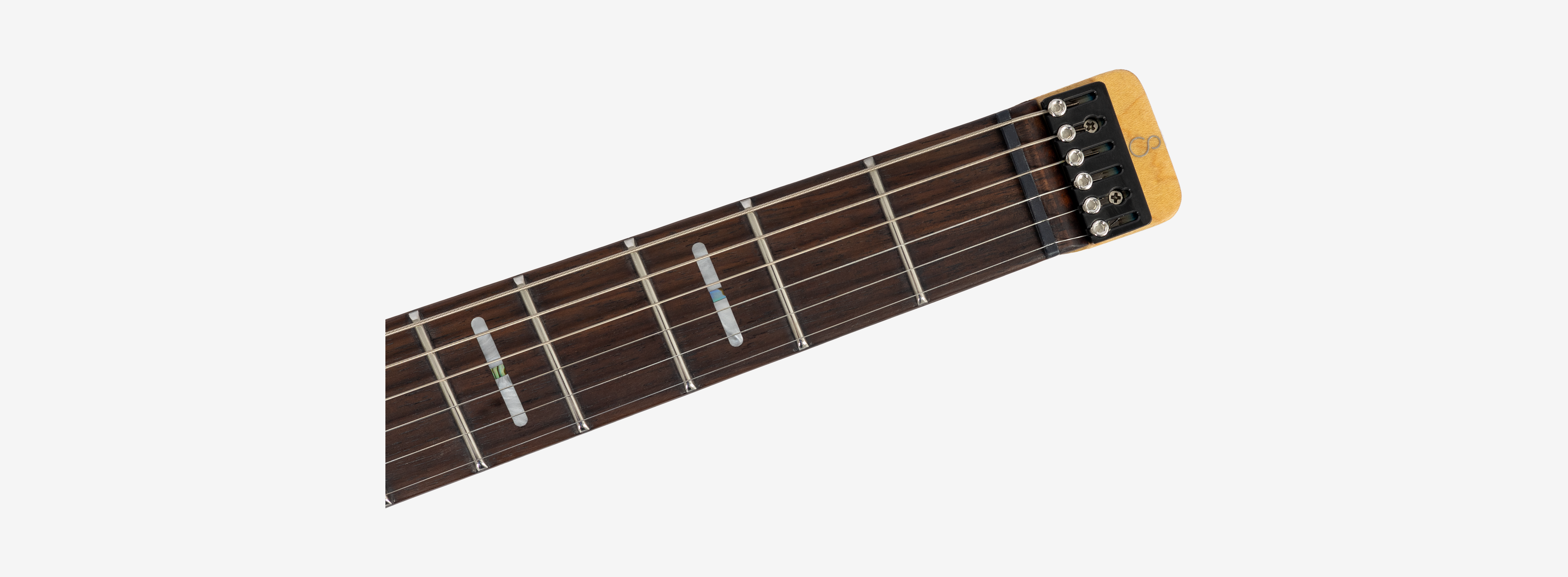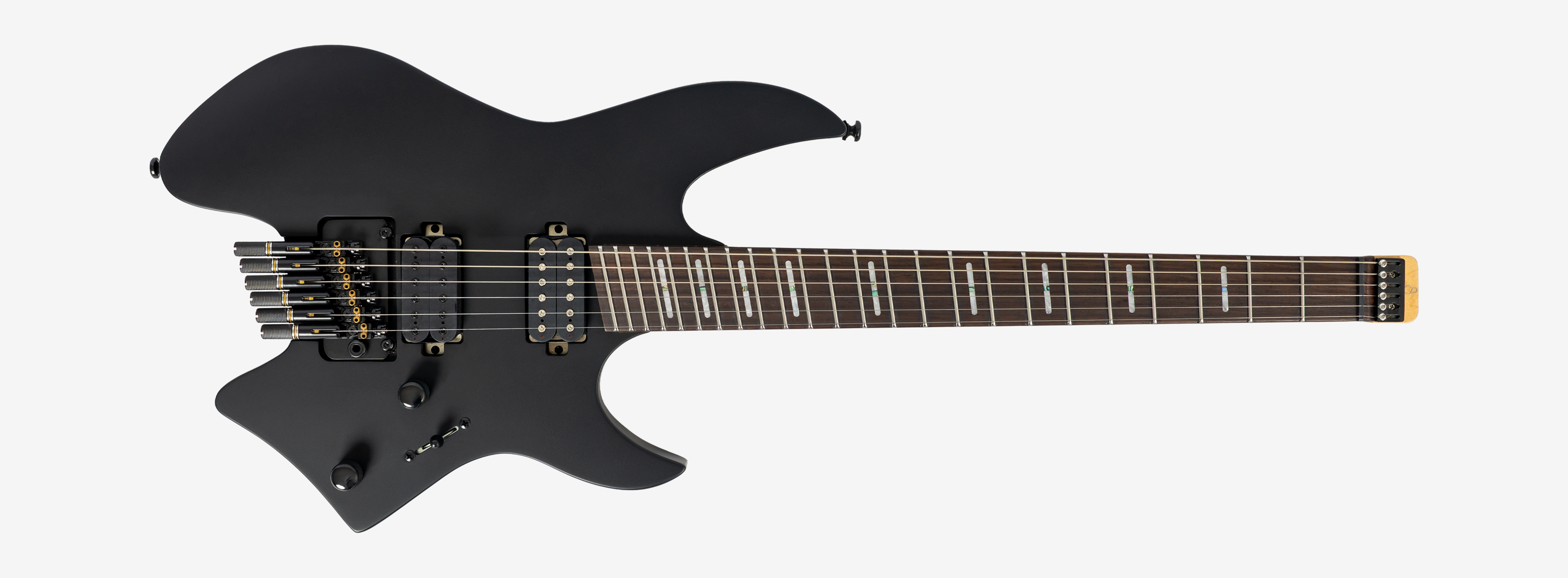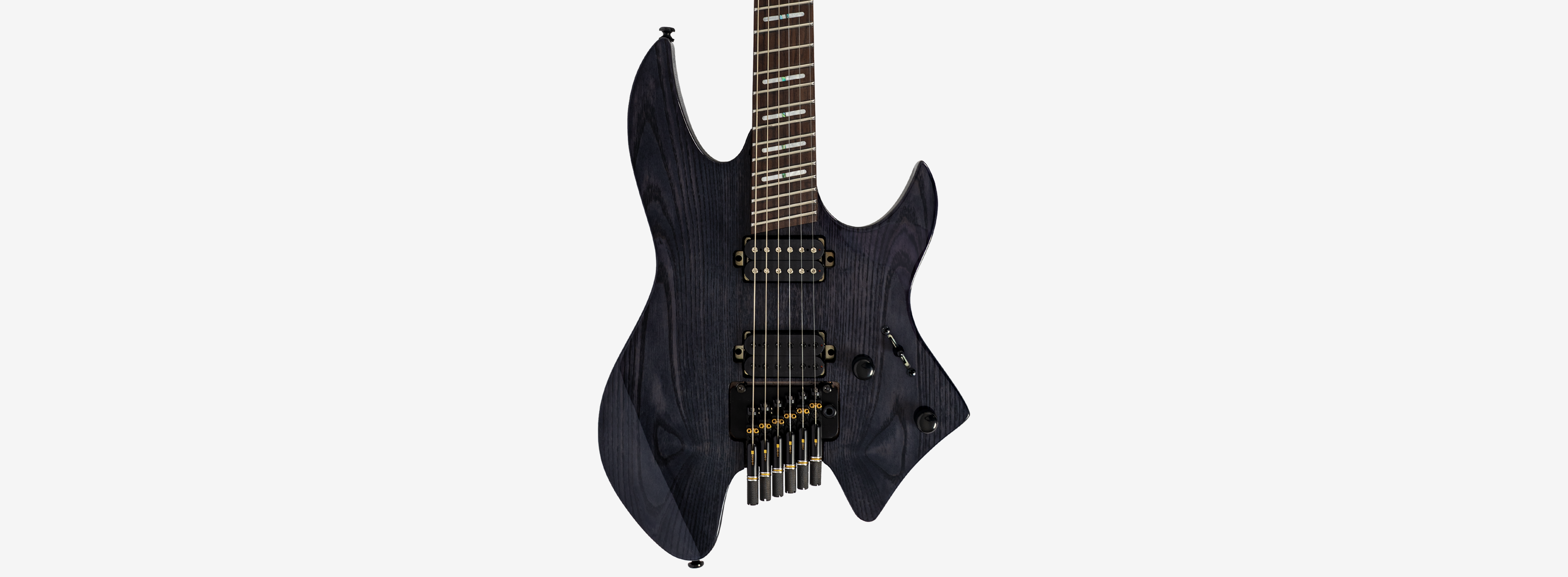 A bridge system designed for the headless style guitar featuring the tuners below the bridge plate promoting on point tuning action, and added stability for improved tone and sustain.