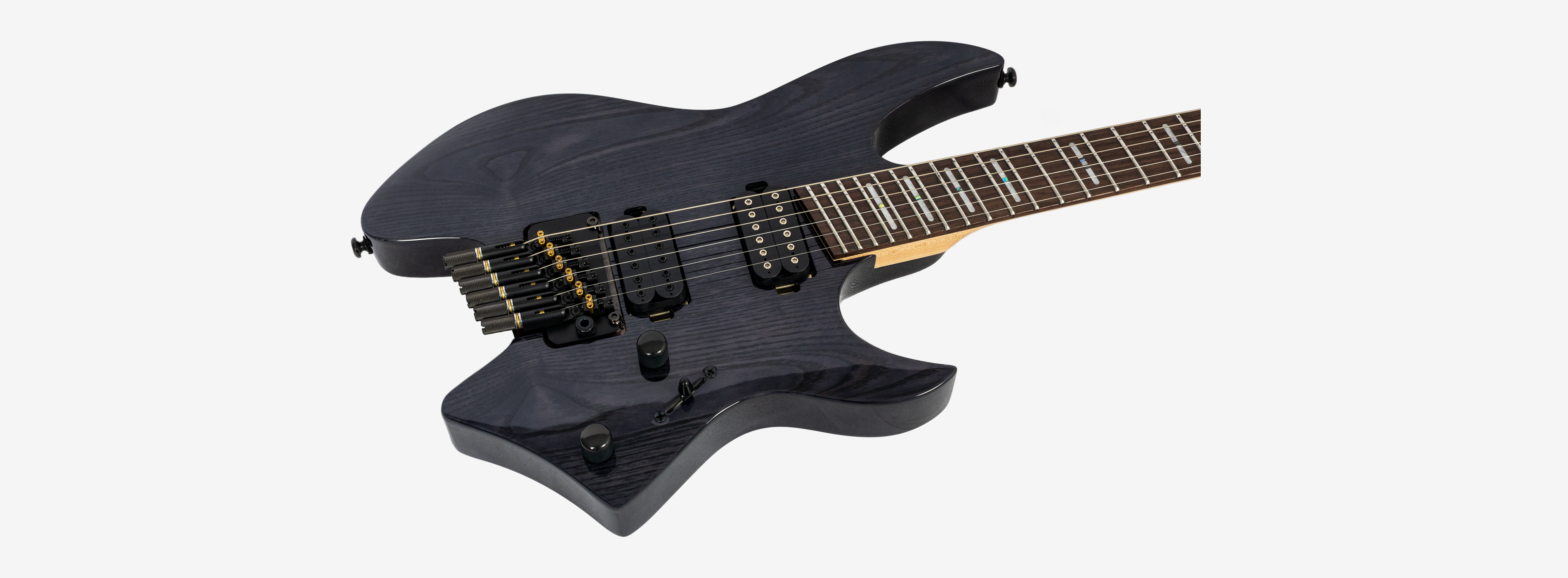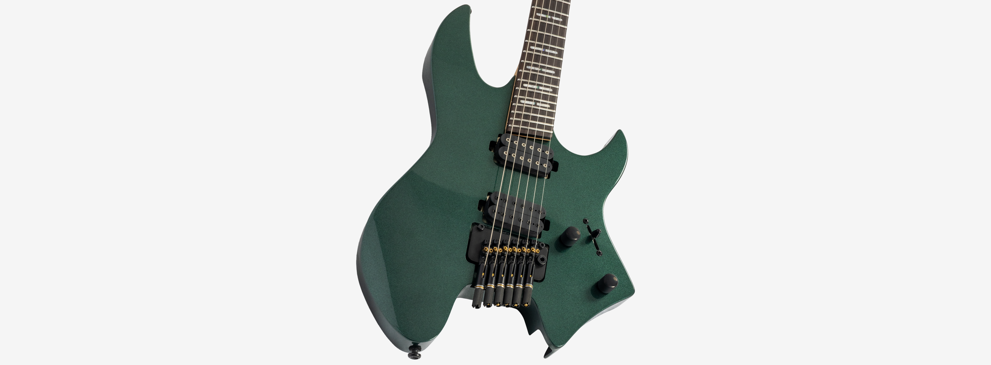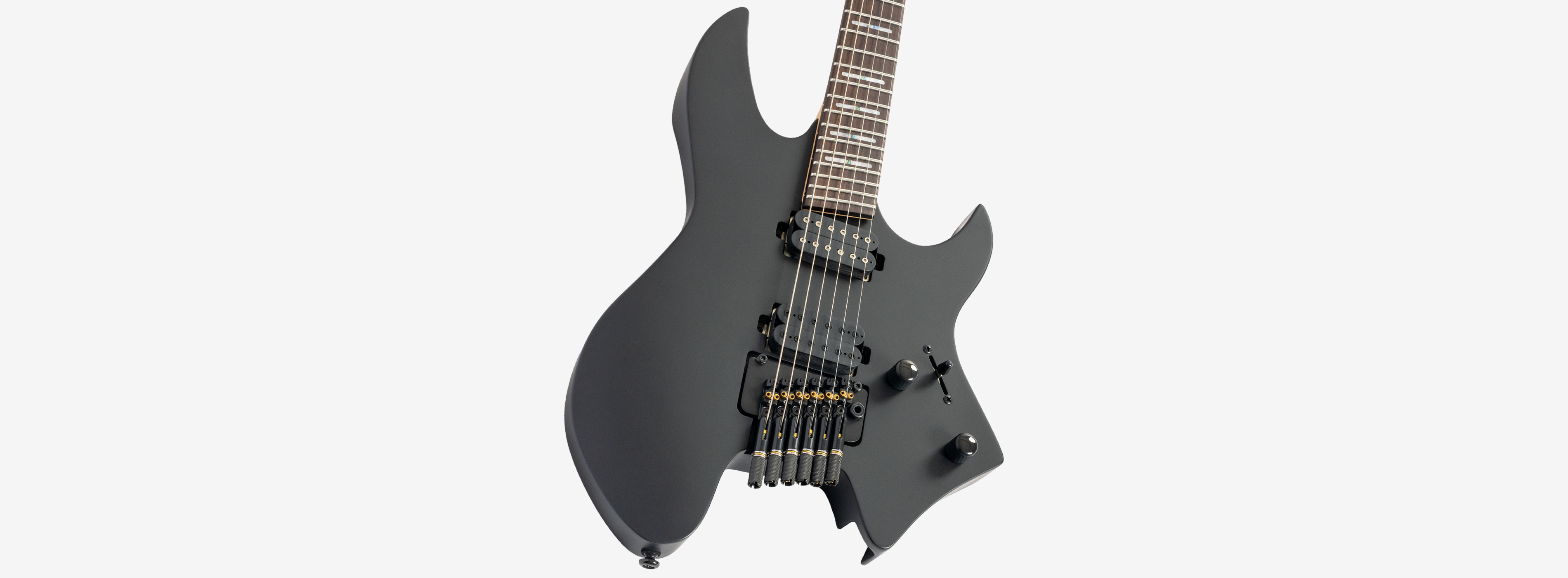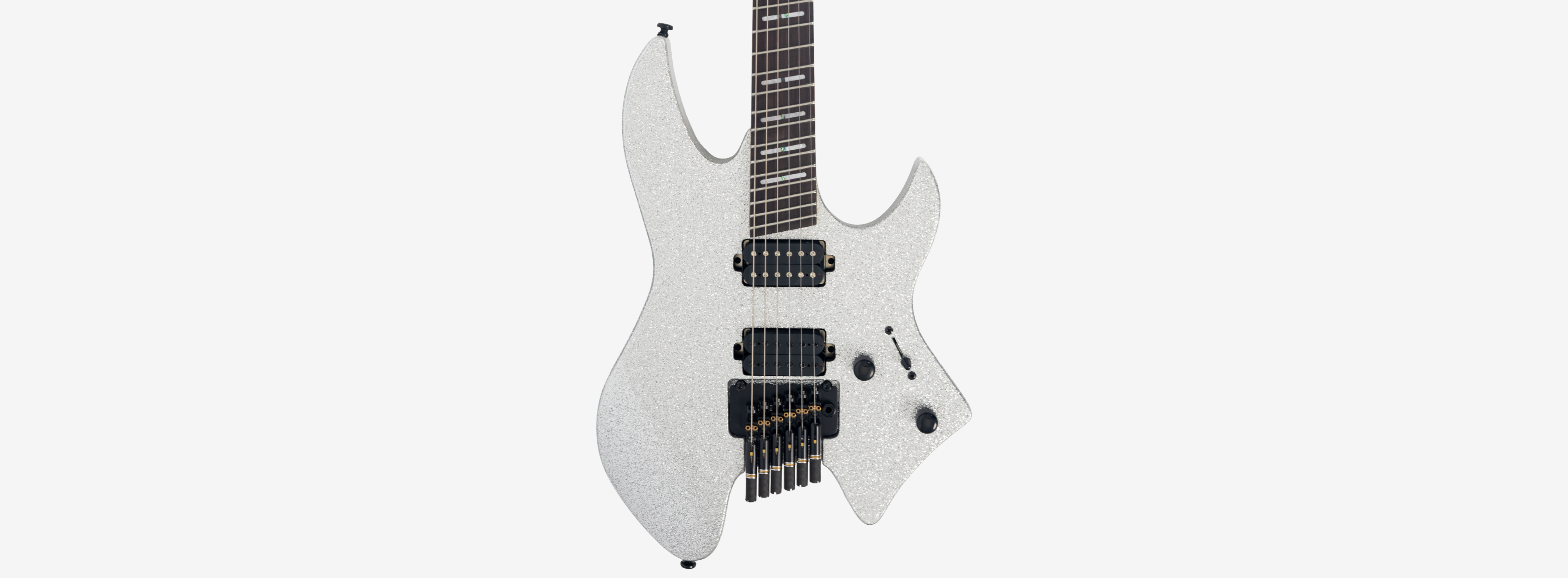 A bridge system designed for the headless style guitar featuring the tuners below the bridge plate promoting on point tuning action, and added stability for improved tone and sustain.