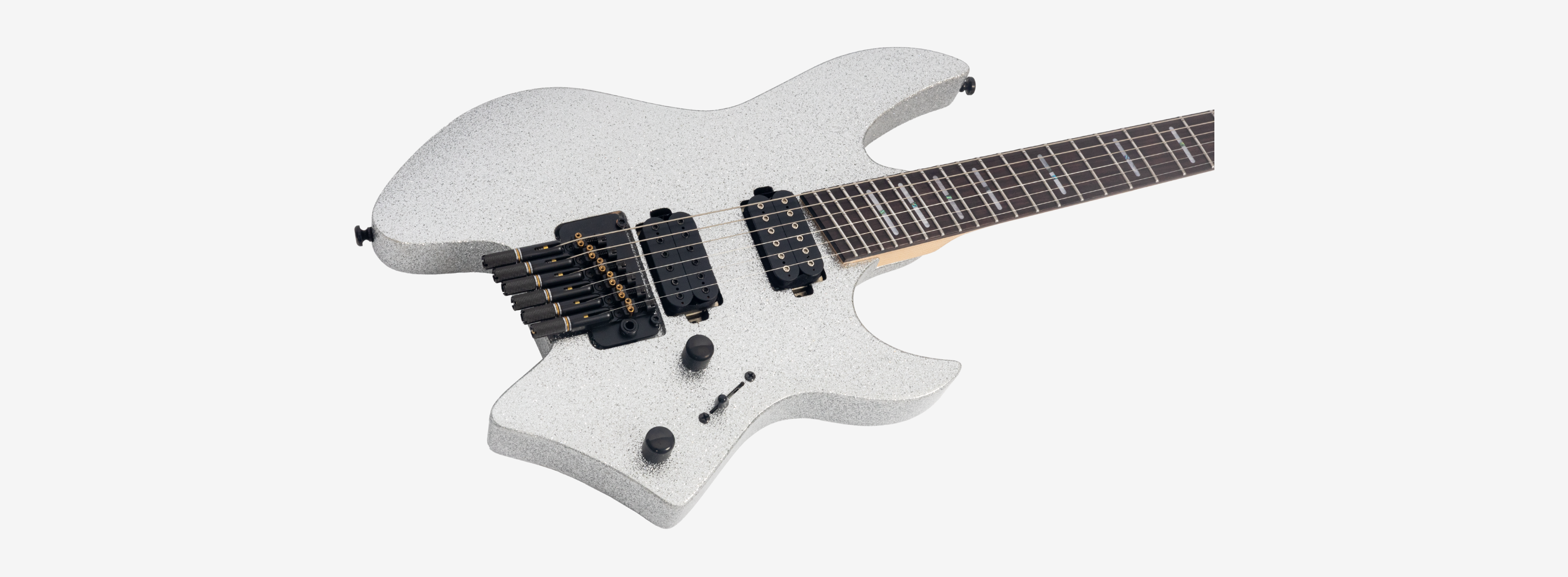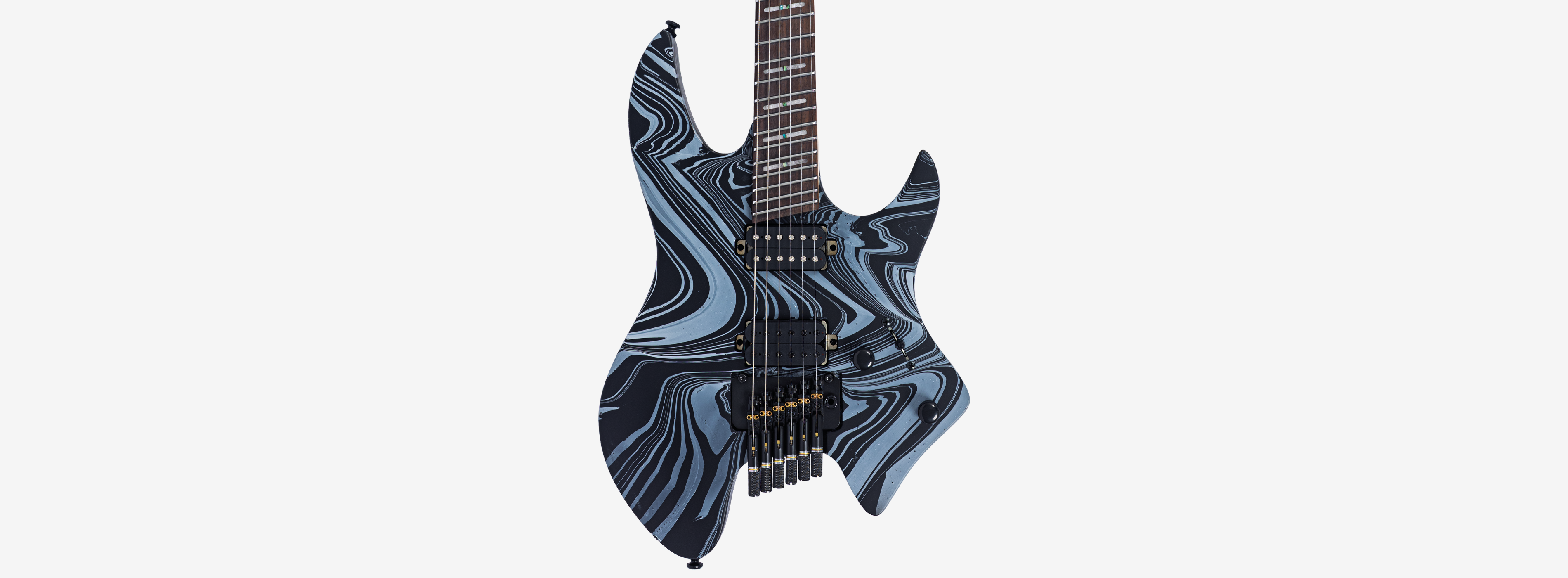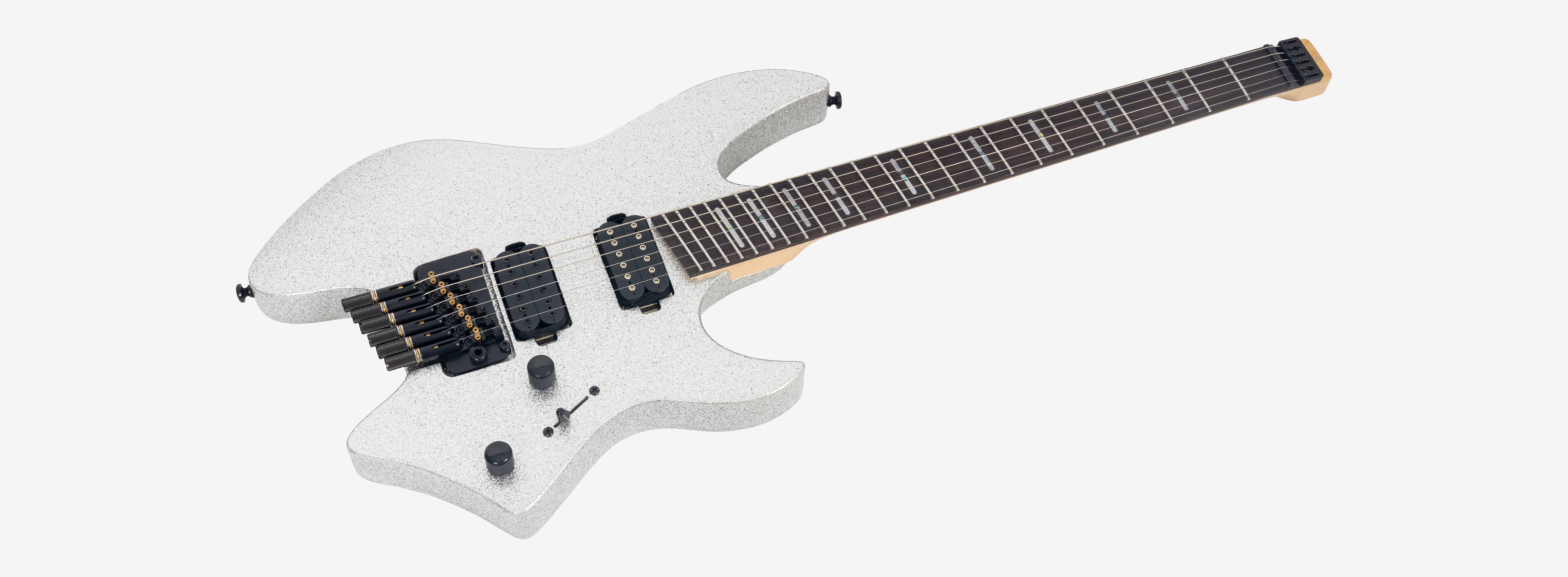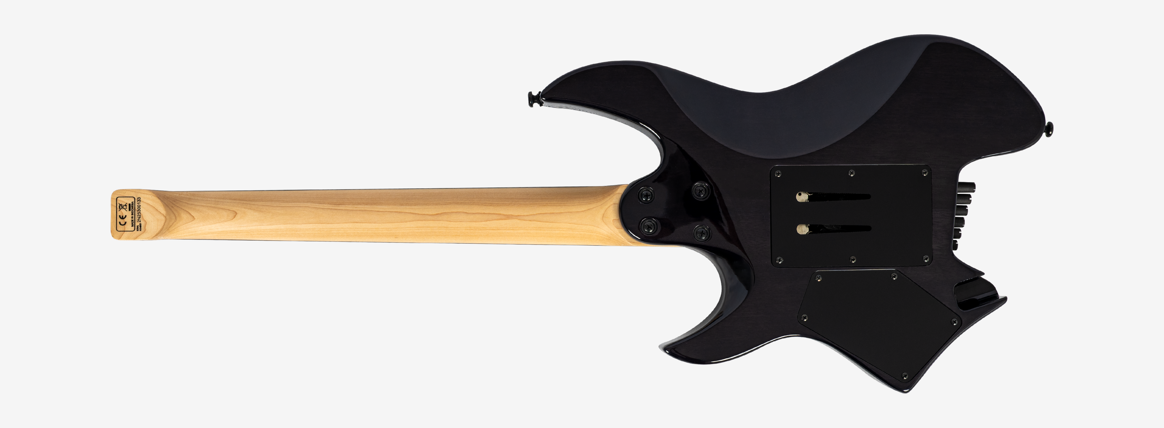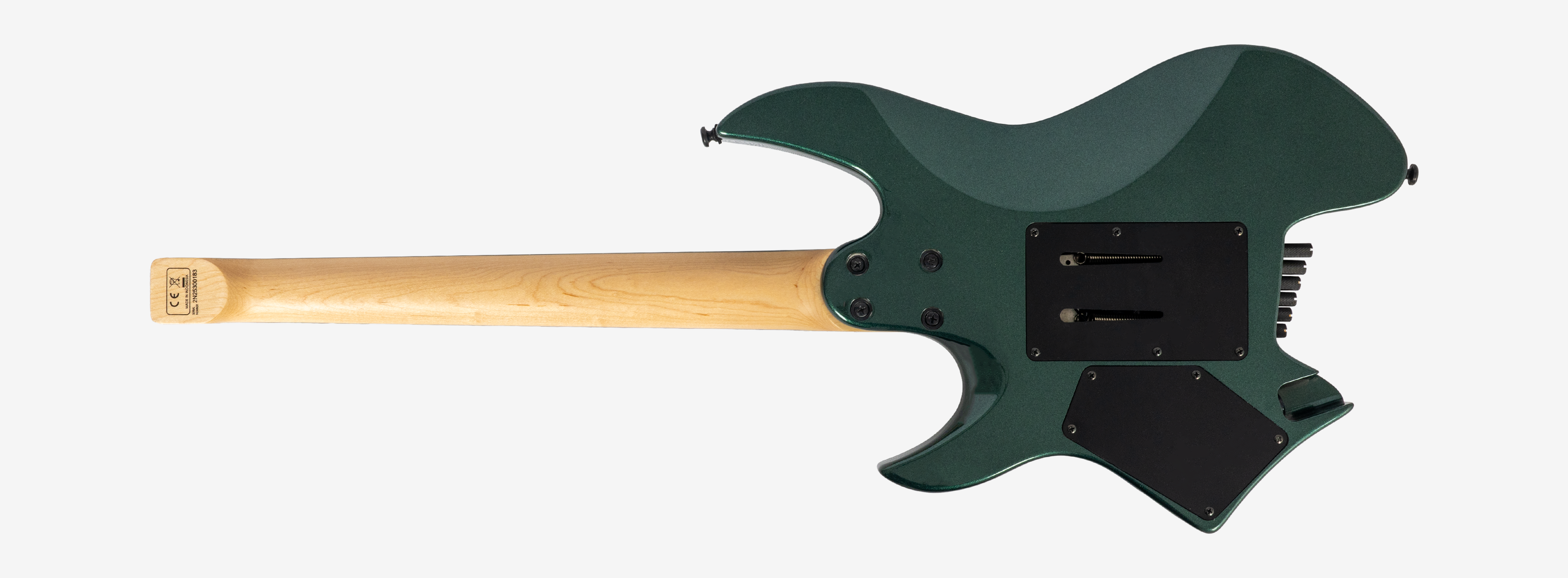 A bridge system designed for the headless style guitar featuring the tuners below the bridge plate promoting on point tuning action, and added stability for improved tone and sustain.